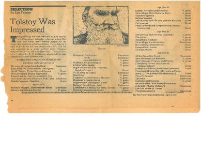 I found something even cooler inside: a yellowed and fragile New York Times Book Review clipping, from April 2, 1978: a list of the books that Tolstoy was most impressed by, organized by the age at which he read them. Gold for this wannabe Tolstoy scholar. I have reproduced it here. Isn’t it tempting to create a list like this for oneself?