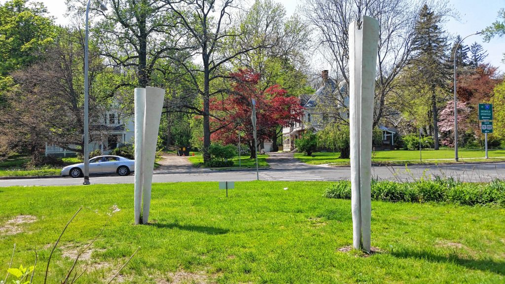 At the intersection of Route 5 and Lincoln Street in Holyoke — between a worn median and a red brick 100-year-old home for sale — stands Peter Dellert’s Sentinels: two slender cement tornados divided.