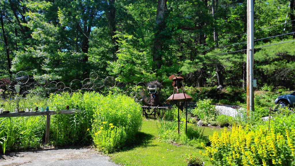 Bike fence. There’s so much going on in the front yard of this North Farms Road home in Florence, let’s break it down piece by piece. First up: There is a metal man with a typewriter for a head and a burst of snarled wires for hair sitting on a bench reading a scrap metal book; then there’s the fence made of bicycle wheels decorated with a bleached bovine skull; a tall salvage-metal crane chills in some tall grass; and a robot throwing its head.