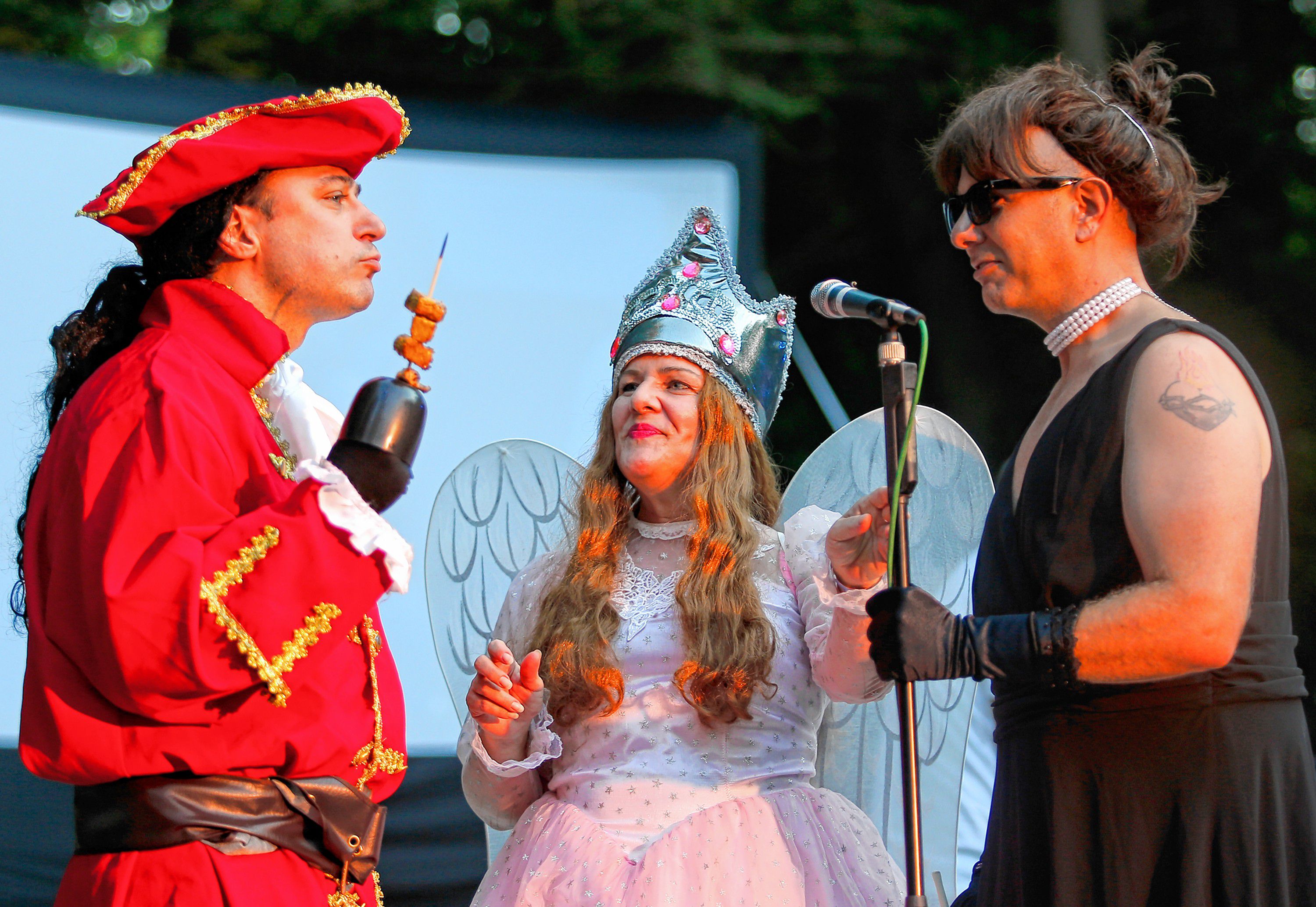 Joshua Braska, left, as Captain Hook, Joan Holliday, as Glinda the Good Witch, and Monte Belmonte as Audrey Hepburn, entertain the crowd in between performances during Transperformance 25- Look at the Movies, Wednesday afternoon at Pines Theater in Florence.