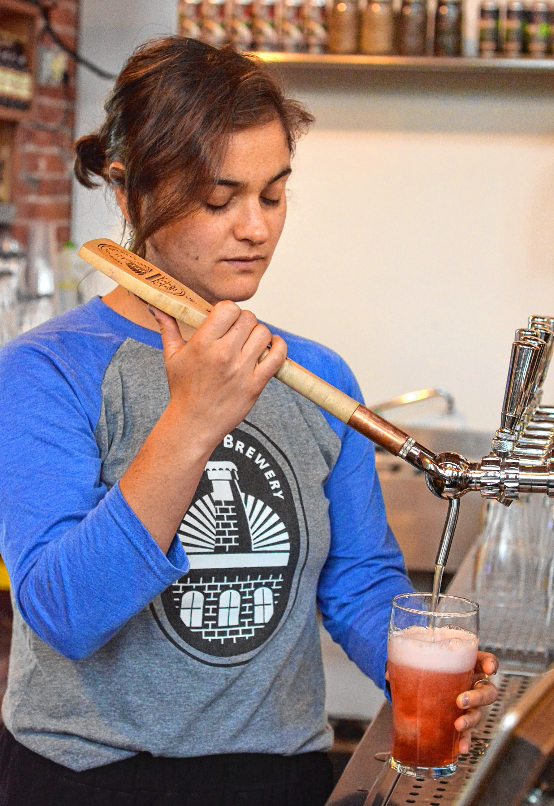 Leah Jacobson pours a combination of Bramble Weiss Sour and Original Ginger Beer at New City Brewery in Easthampton, Tuesday, May 28, 2019. Katrina Pierson, the taproom manager said the combination, “mellows the sour taste and adds ginger spice.”