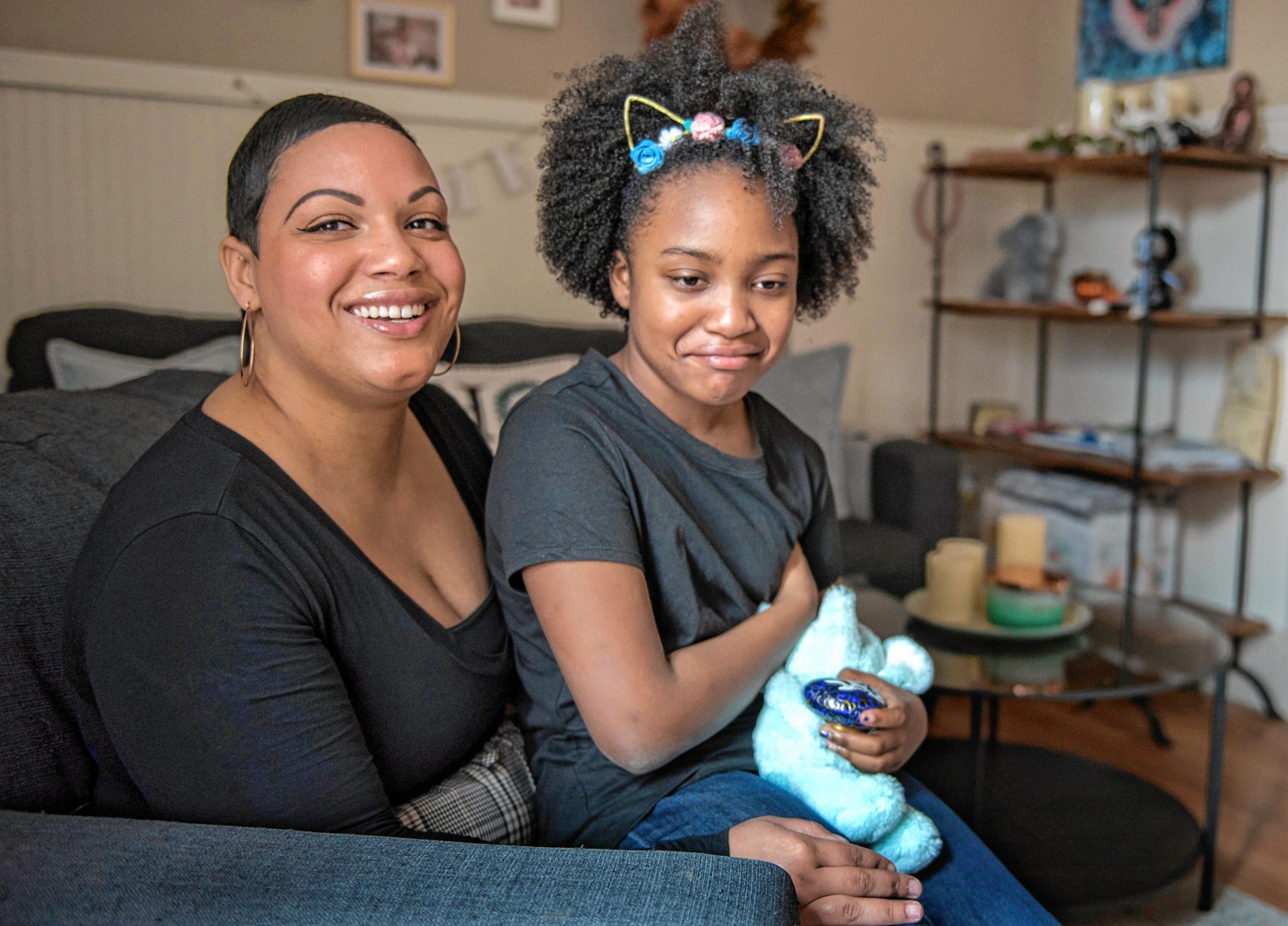 Emily Collins and her daughter, Gabrielle Collins-Hill, 8, pose in their Holyoke home with an urn containing the ashes of her son, Sebastian, who died in 2018 at the age of 2 weeks. Photographed on Wednesday, March 18, 2020.
