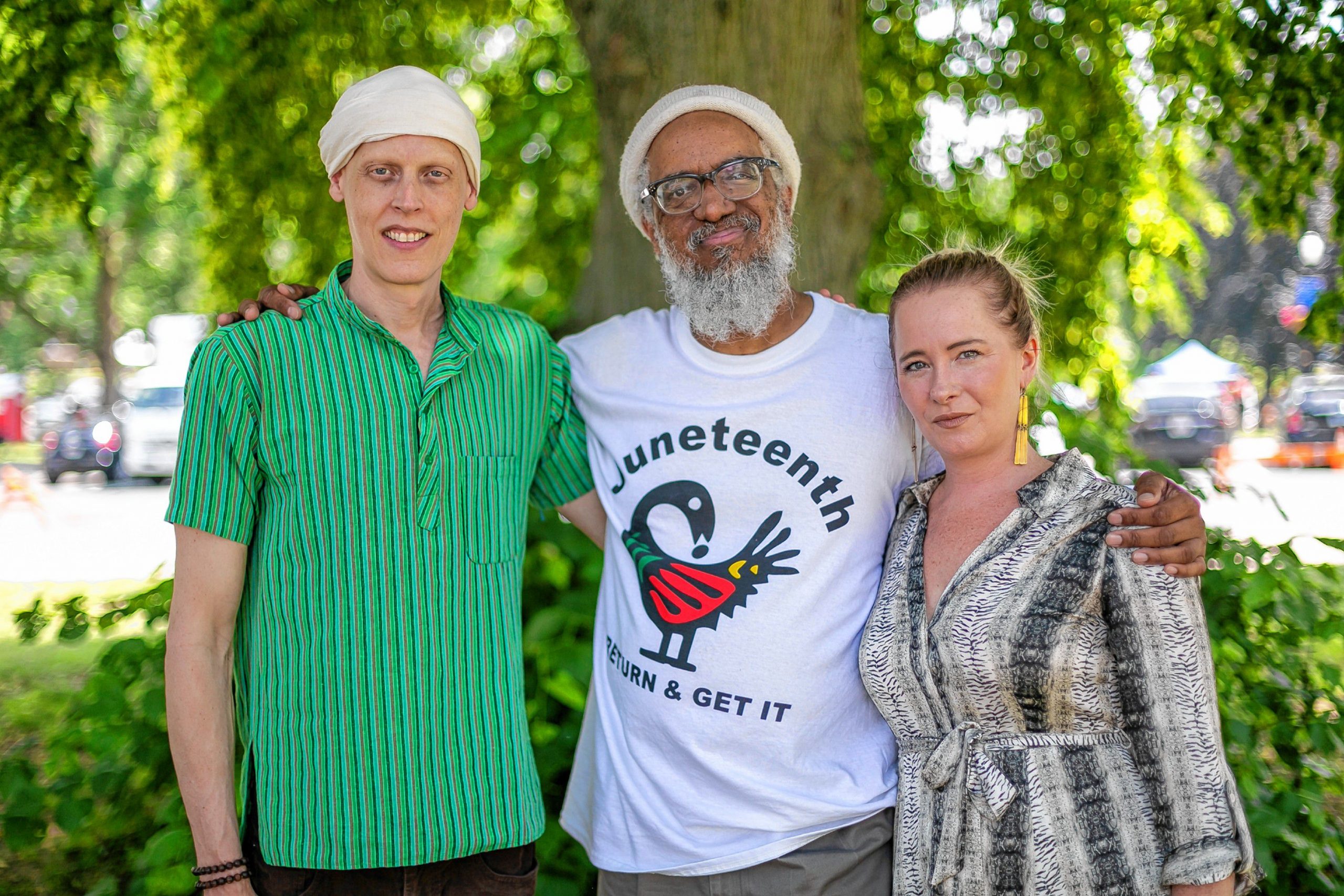 Reparations for Amherst (R4A) Founders Matthew Andrews and Michele Miller stand with Dr. Amilcar Shabazz, Professor at the W.E.B. DuBois Department of African American Studies at UMASS Amherst, outside a Juneteenth Community Jubilee Celebration in the town common, Saturday in Amherst, MA.