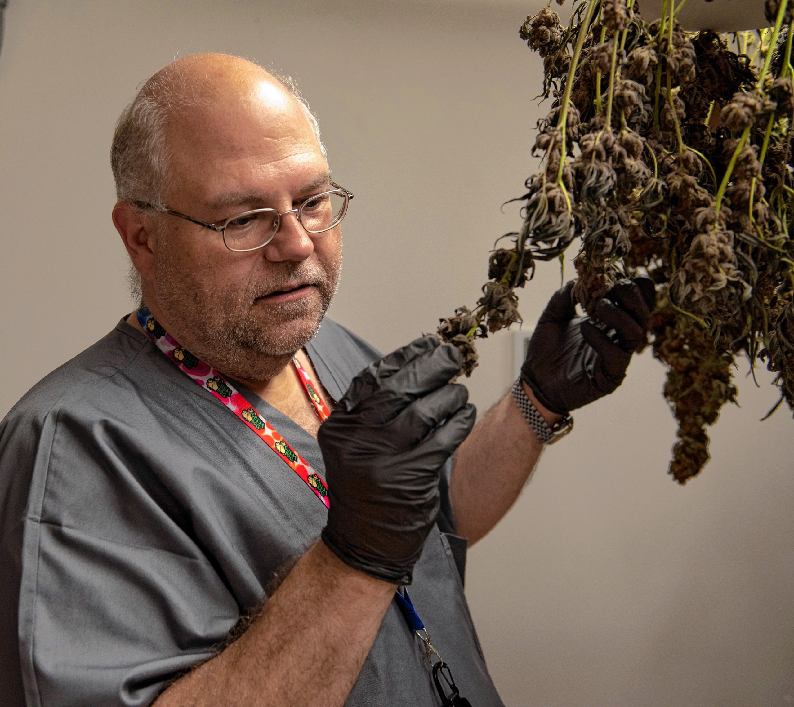Greg “Chemdog” Krzanowski, the director of cultivation at Canna Provisions, looks over marijuana drying at the grow facility in Sheffield Ma.