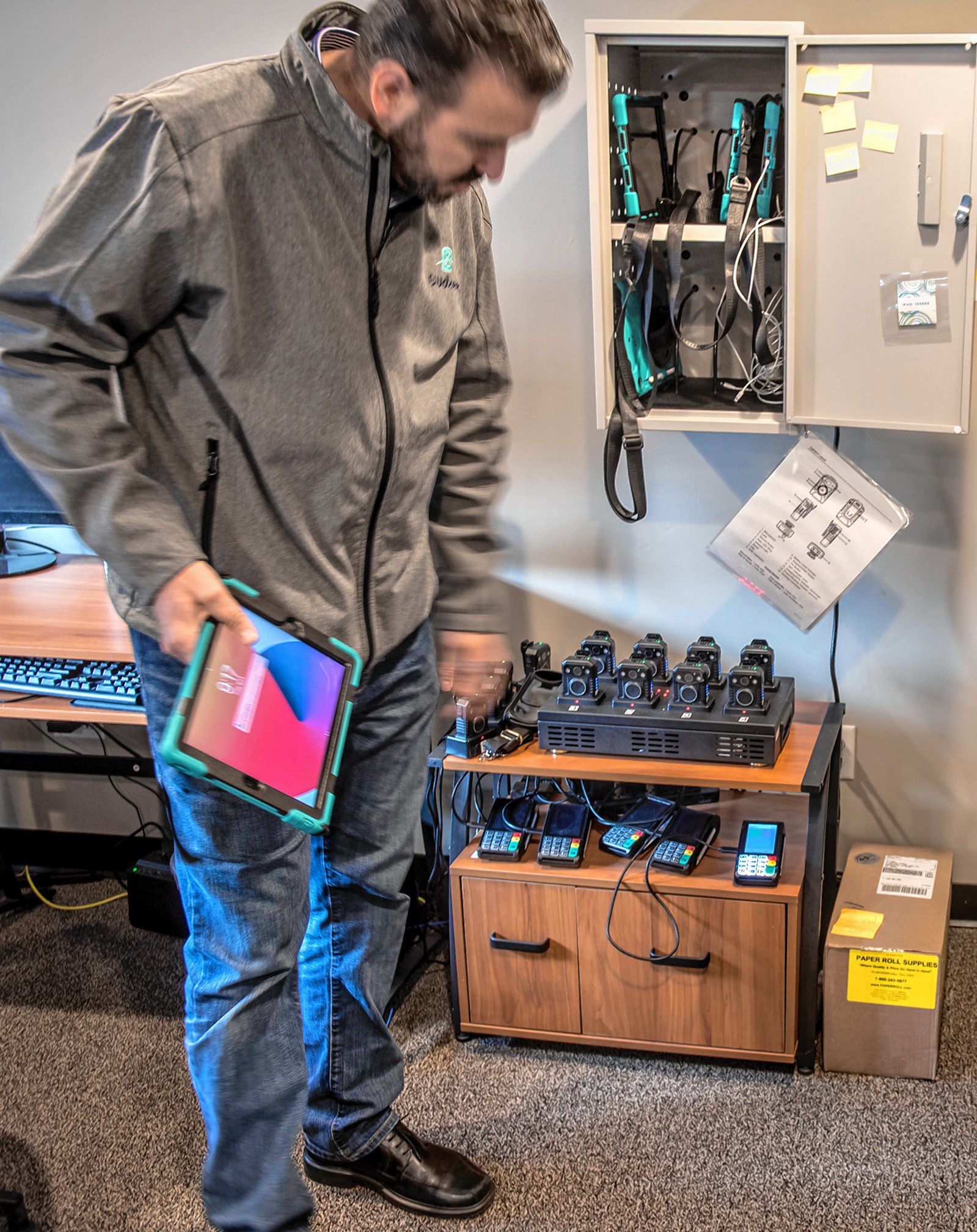 Budzee COO Volkan Polatol looks over a charging station for tablets and body cameras in the drivers’ room of the cannabis delivery business’s Easthampton warehouse on Friday, April 8, 2022.