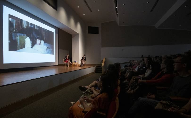 Author and illustrator Grace Lin, left, speaks about her childhood during the members’ preview of “The Art of Grace Lin: Meeting a Friend in an Unexpected Place” at The Eric Carle Museum of Picture Book Art, Friday, June 13, in Amherst.