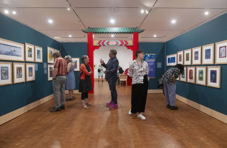 Patrons view different pieces during the members’ preview of “The Art of Grace Lin: Meeting a Friend in an Unexpected Place” at The Eric Carle Museum of Picture Book Art.