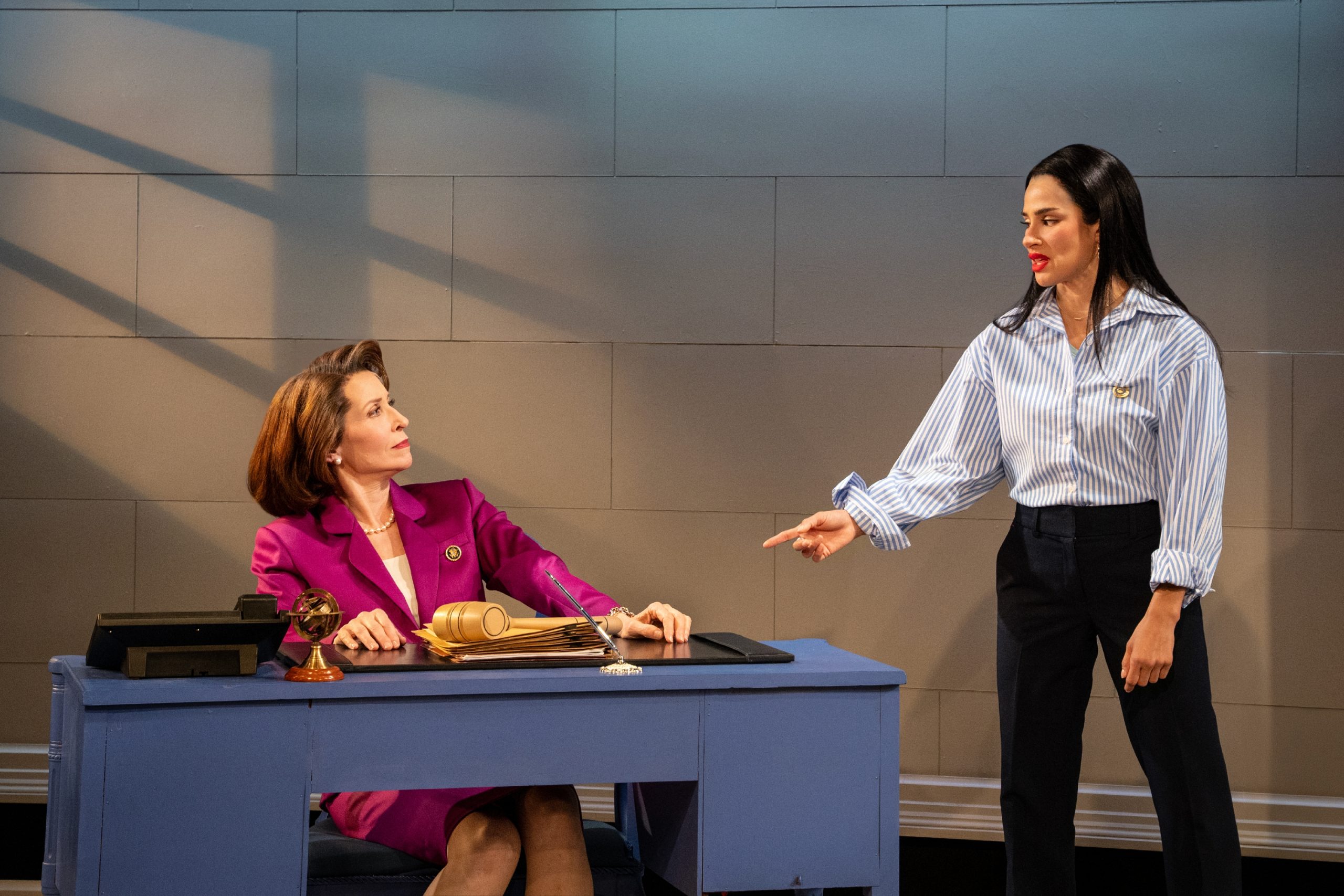Kelly Lester as Nancy Pelosi and Diane Guerrero as Alexandria Ocasio-Cortez in Mario Correa’s “N/A” at Barrington Stage Company’s St. Germain Stage.
