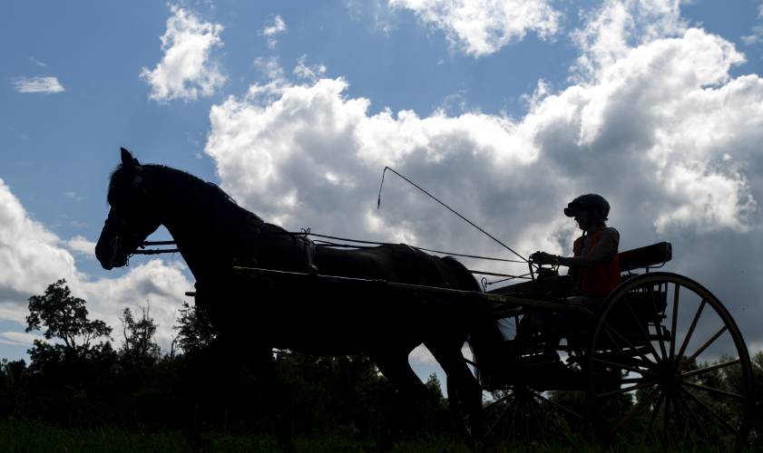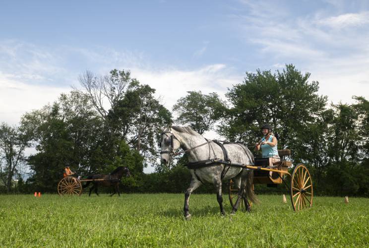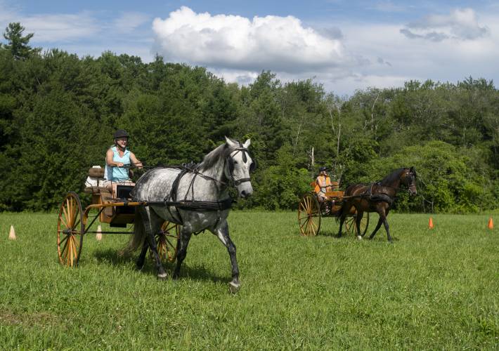 Malise Stoddard and Dani, left, and Christina Pierce and Luke, right, both drive carriages at Pierce’s farm, Tuesday, July 8, 2025, in Montgomery. Danny and Luke are both Morgan horses, whose breeding began in Massachusetts, dating back to the late 18th century. STAFF PHOTO / DANIEL JACOBI II—