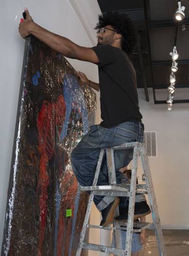 Indë installs artwork for their upcoming show, “Mirror Mirror,” at the A.P.E Gallery in Northampton. The show runs through Aug. 8 and the opening reception is on Friday, July 25. STAFF PHOTO/CAROL LOLLIS