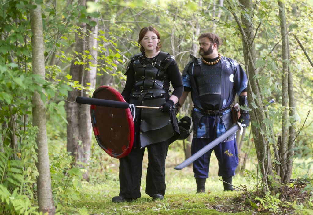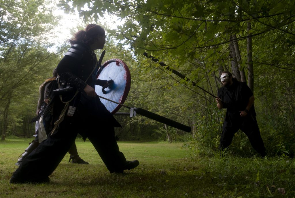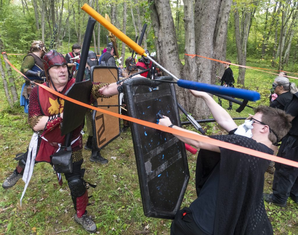 But on this September day, in their place, honorable knight Miracle Max, powerful healer Skylar Keasilis and noble fighter Kaninzi enter the clearing. Max and Kaninzi, adored with chainmail and dark metal armor, are swept into the chaos of battle, blocking attacks with their shields before taking swings with their swords.