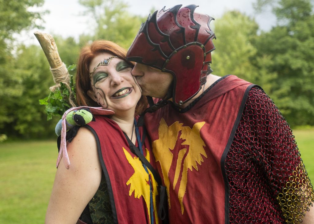 Maria “Liselle Silvermaple” Carr, left, receives a kiss from Nate “Aelias Softshadow” Carr during an event held by The Realms live action role-playing (LARP) group, Saturday, Sept. 13, 2025, in Granby. The two originally met through the LARP group and eventually married. Staff Photo/Daniel Jacobi II
