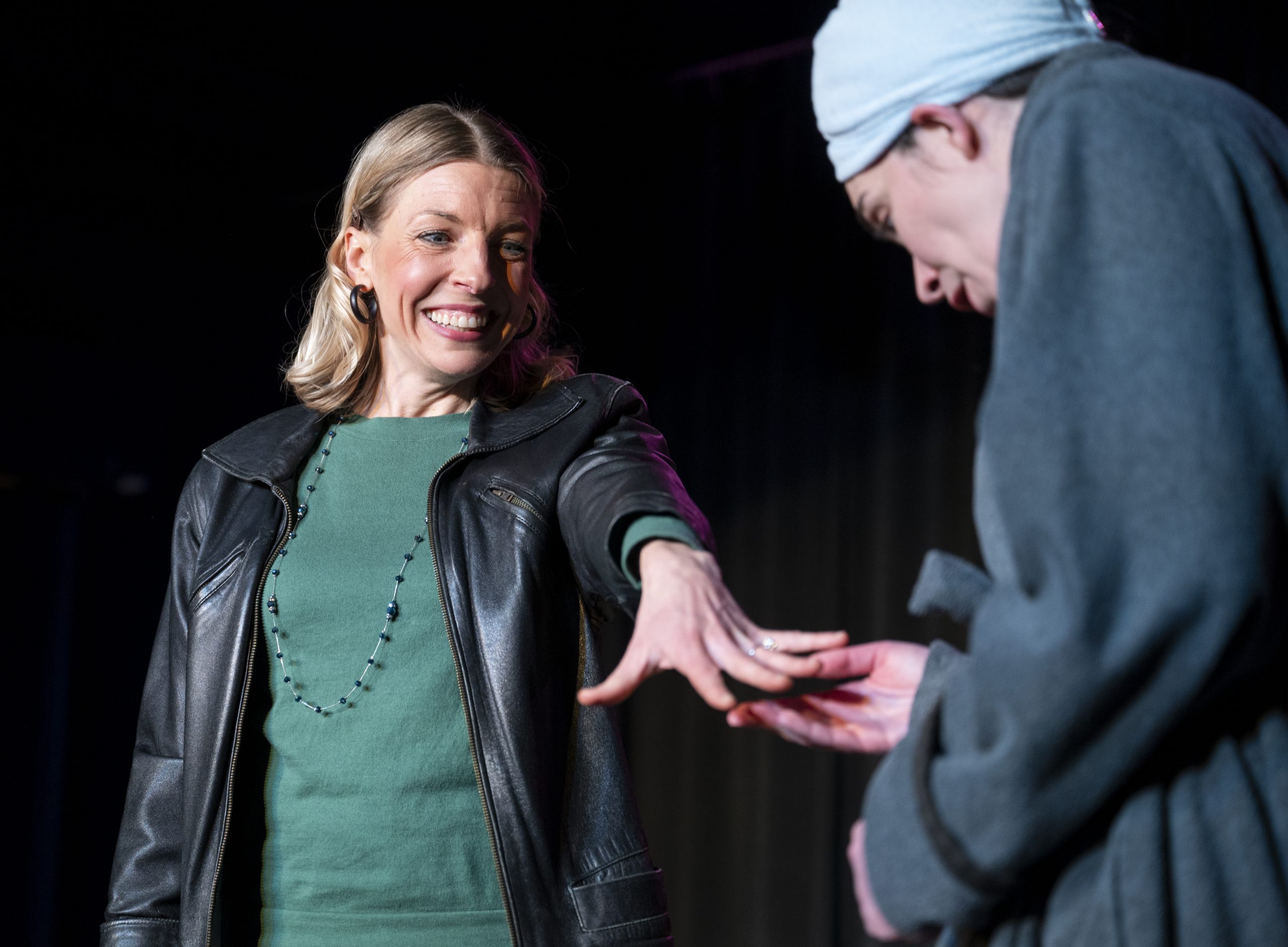 Anne Zager, left, playing Claire, and Kim Gaughan, right, playing Catherine, perform during a rehearsal for Heartbeat Theater’s production of “Proof” at CitySpace in Easthampton. DANIEL JACOBI II / Staff Photo
