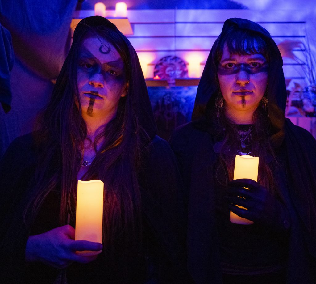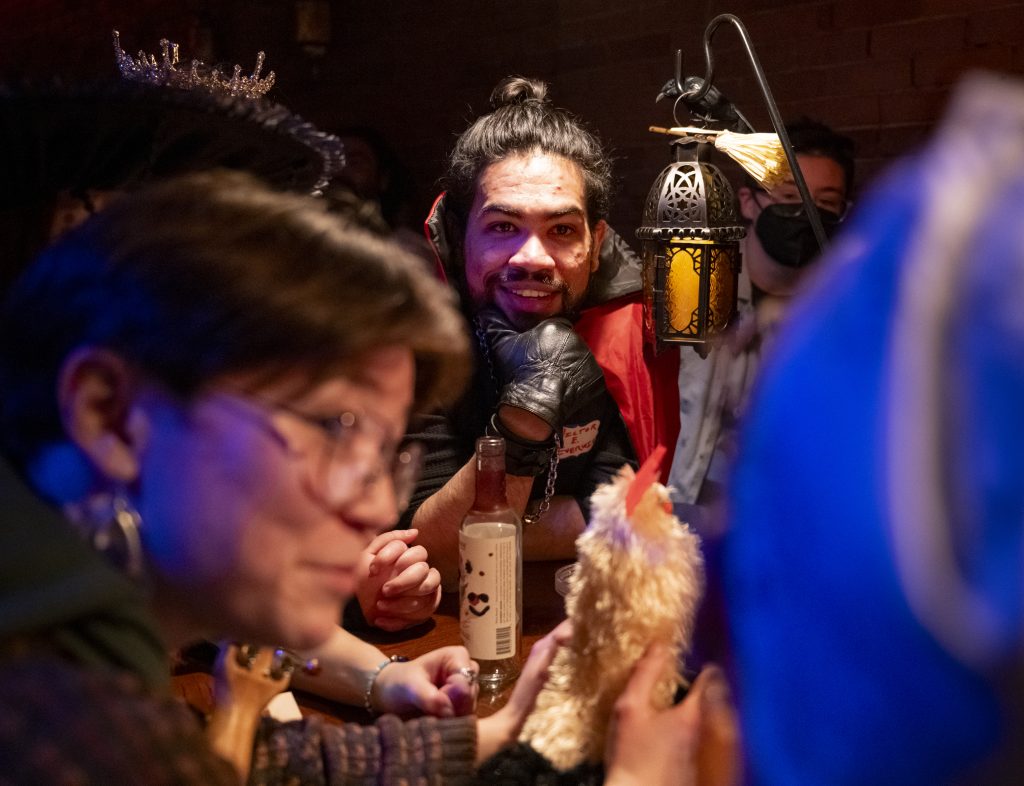 At the Medieval Fantasy Tavern, on the evening of Saturday, Dec. 6, the reunion crowd swelled to nearly 50. Marilena Vulpes (played by Fitzgerald), a vampiric redhead with dark lipstick and a Bela Lugosi-inspired accent, and her fiancé Dionisie “Dio” Georgescu (Fitzgerald’s real-life boyfriend, Ray Tannheimer, who is also a member of the Quonk leadership team) were poised to take the stage.