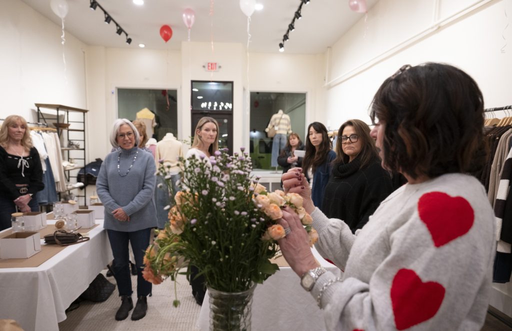 At the front of Harper James, an upscale women’s clothing store in Easthampton, the owner of Blooms Studio, Tina D’Agostino, stood before the women and unfastened a bouquet. Behind her, red, pink and white balloons hovered along the ceiling. The boutique’s owner, Kayla Diggs, watched from the front of the store, where in the window, underneath a mannequin, was a spread of chocolate-covered strawberries, sugar cookies and truffles, and fine wine nestled in a bucket of ice.